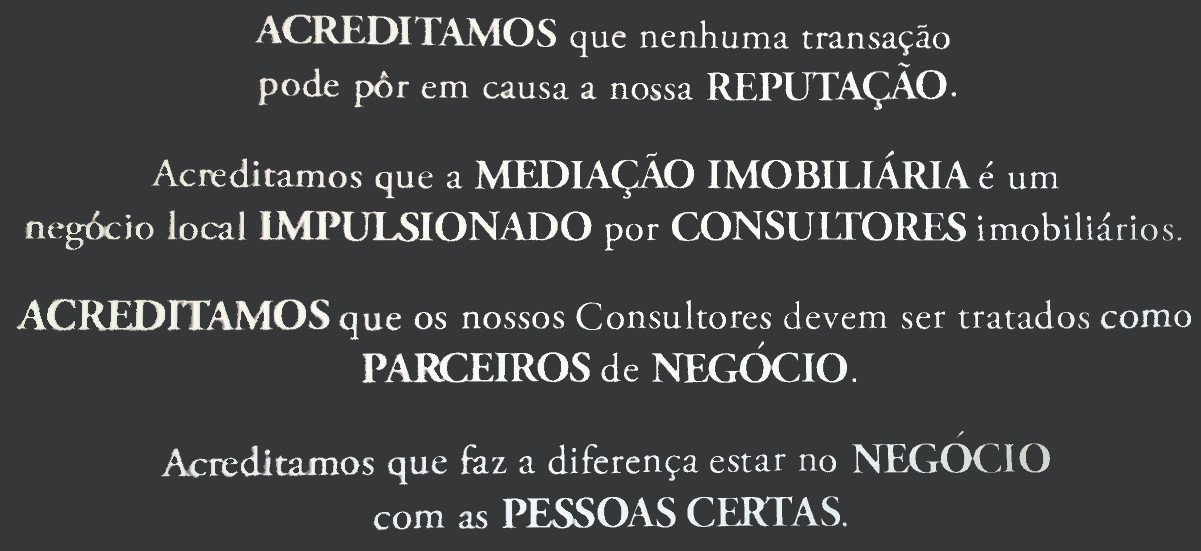 A qualidade da nossa formação pessoal e profissional, traduz-se no melhor serviço ao cliente. Desde a elaboração do estudo de mercado para o imóvel em concreto e sua promoção estratégica, qualificação e devida gestão de clientes compradores, apresentação e negociação de propostas, do acompanhamento de todo o processo até fecho e pós-venda, porque a Mediação Imobiliária é muito mais do que vender casas. São as relações e os laços criados com as pessoas que ficam para a vida.